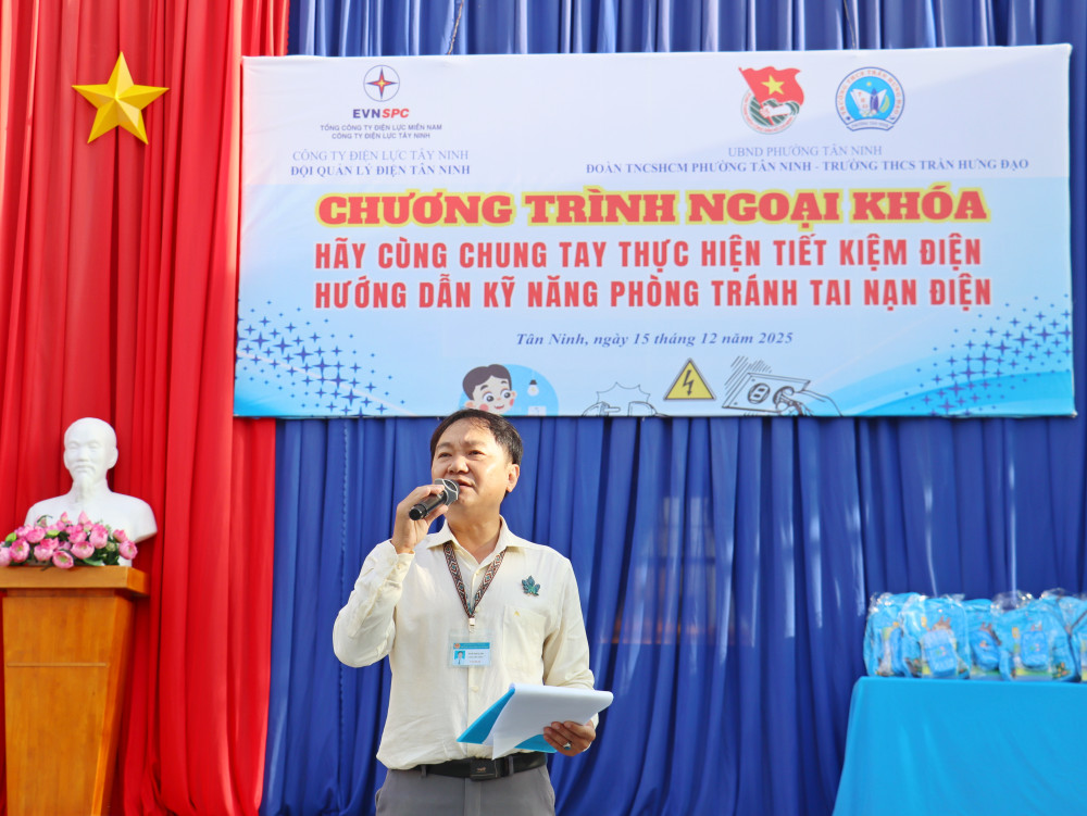 Sáng ngày 15/12/2025, Đội Quản lý điện Tân Ninh phối hợp với Đoàn phường Tân Ninh và Ban Giám hiệu trường THCS Trần Hưng Đạo tổ chức chương trình tuyên truyền ngoại khóa với chủ đề “Hãy chung tay thực hiện tiết kiệm điện – Hướng dẫn kỹ năng phòng tránh tai nạn điện” dành cho các em học sinh.